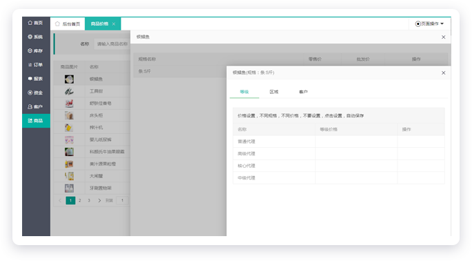訂單人員、庫管人員、財務人員,系統(tǒng)權限都不同,業(yè)務人員管轄的客戶也相互獨立;不同層級客戶可以設置等級價,不同客戶區(qū)域也可設置區(qū)域價,也可以單獨為某個客戶設置價格,同種商品,不同規(guī)格價格也可不同!